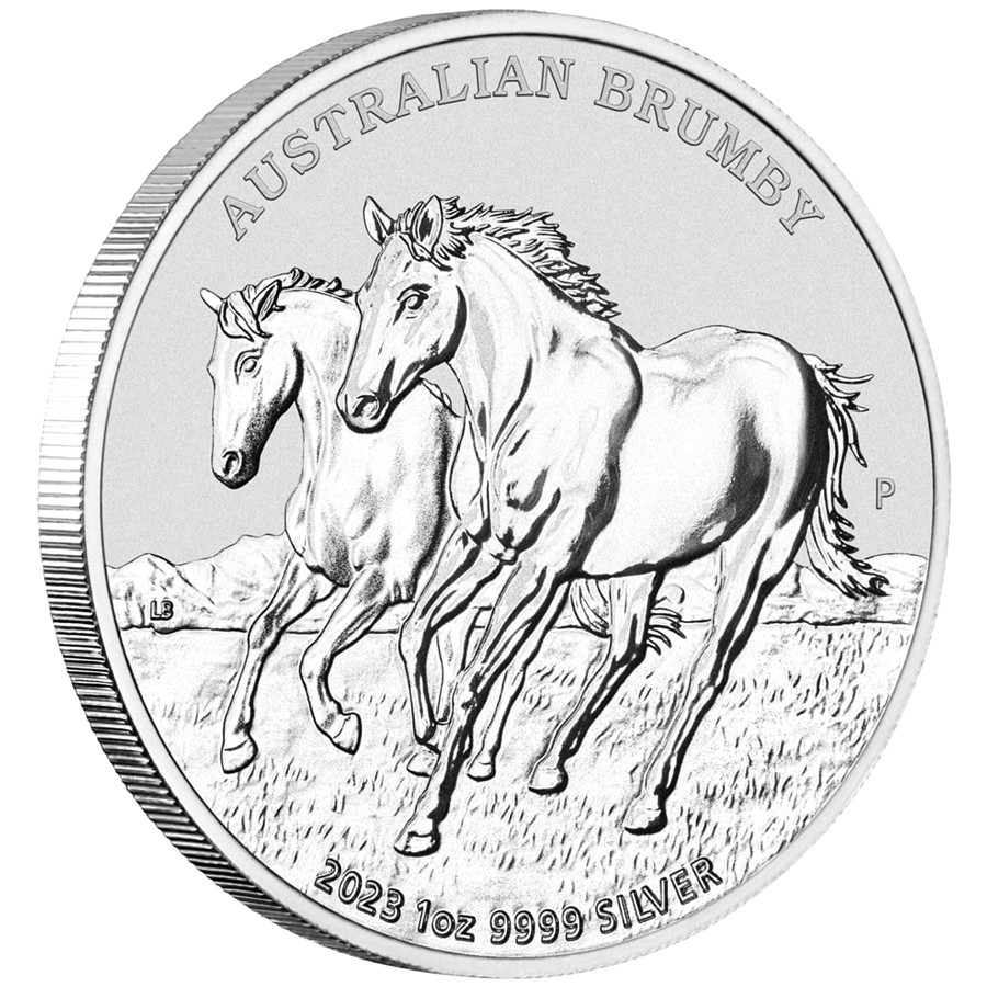 The reverse of this silver investment coin depicts two horses galloping side by side with mountain scenery in the background. The coin is lined with the inscription "AUSTRALIAN BRUMBY" and information on the issue, weight, purity and initial of the Perth Mint "P".